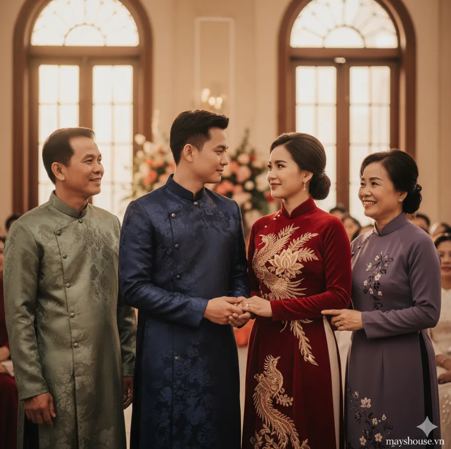 Và đừng nghĩ rằng áo dài chỉ dành cho cô dâu. Ngày nay, áo dài cũng đã trở thành lựa chọn tinh tế cho chú rể, giúp chàng thể hiện sự lịch thiệp, trang trọng. Cả hai cùng sánh bước trong tà áo dài đôi, cùng với sự góp mặt của áo dài dành cho cha mẹ và họ hàng hai bên, tất cả tạo nên một tổng thể hài hòa, ấm cúng và đầy tính gắn kết.