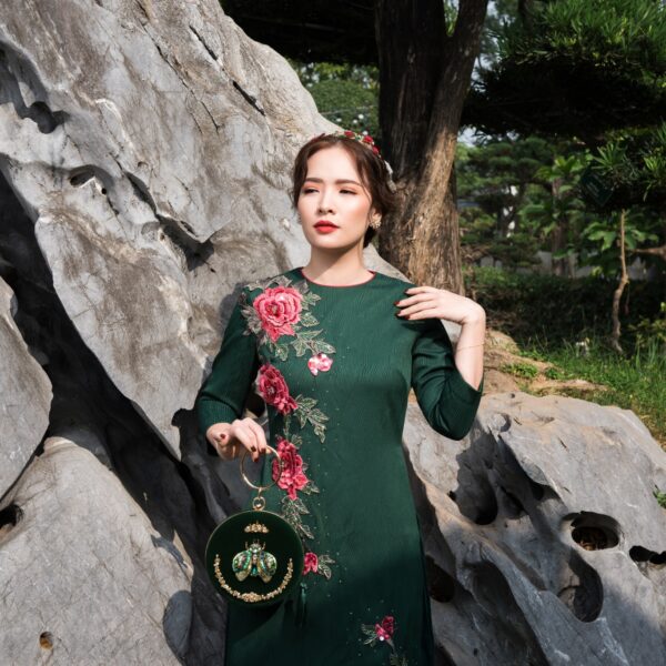 Bộ áo dài vân gỗ hoa hồng – Rêu