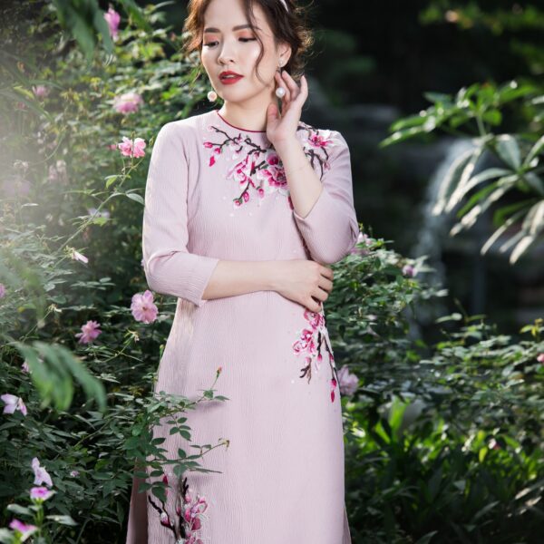 Bộ áo dài vân gỗ hồng hoa hồng – Hồng