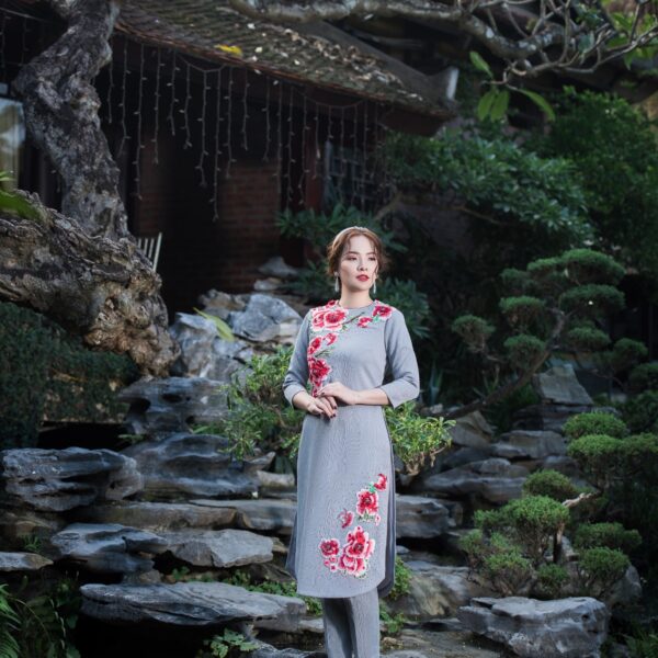 Bộ áo dài vân gỗ hoa hồng – Ghi