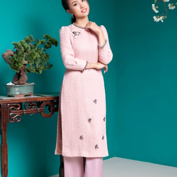 Bộ áo dài nữ Sequin đính sticker cách tân hồng