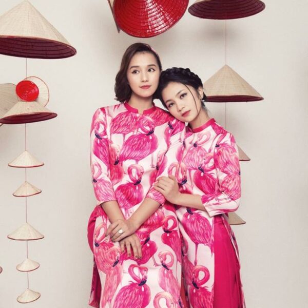 Bộ áo dài nữ Sequin đính sticker cách tân hồng