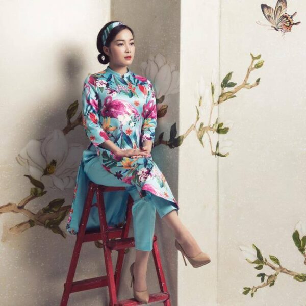 Bộ áo dài nữ kết cườm vân gỗ hoa hồng xanh – Trắng