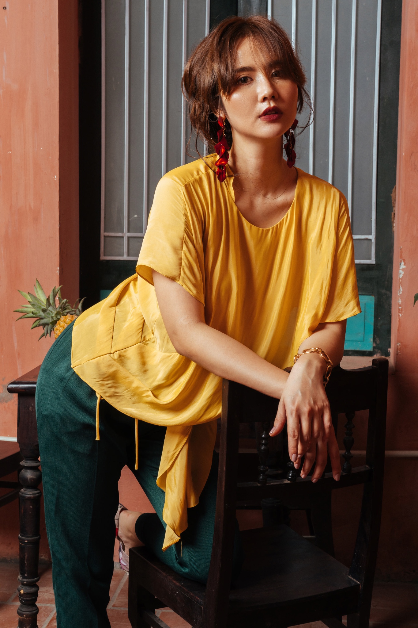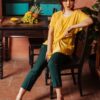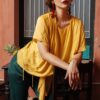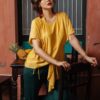 Áo kiểu cộc tay vạt chéo vàng mustard